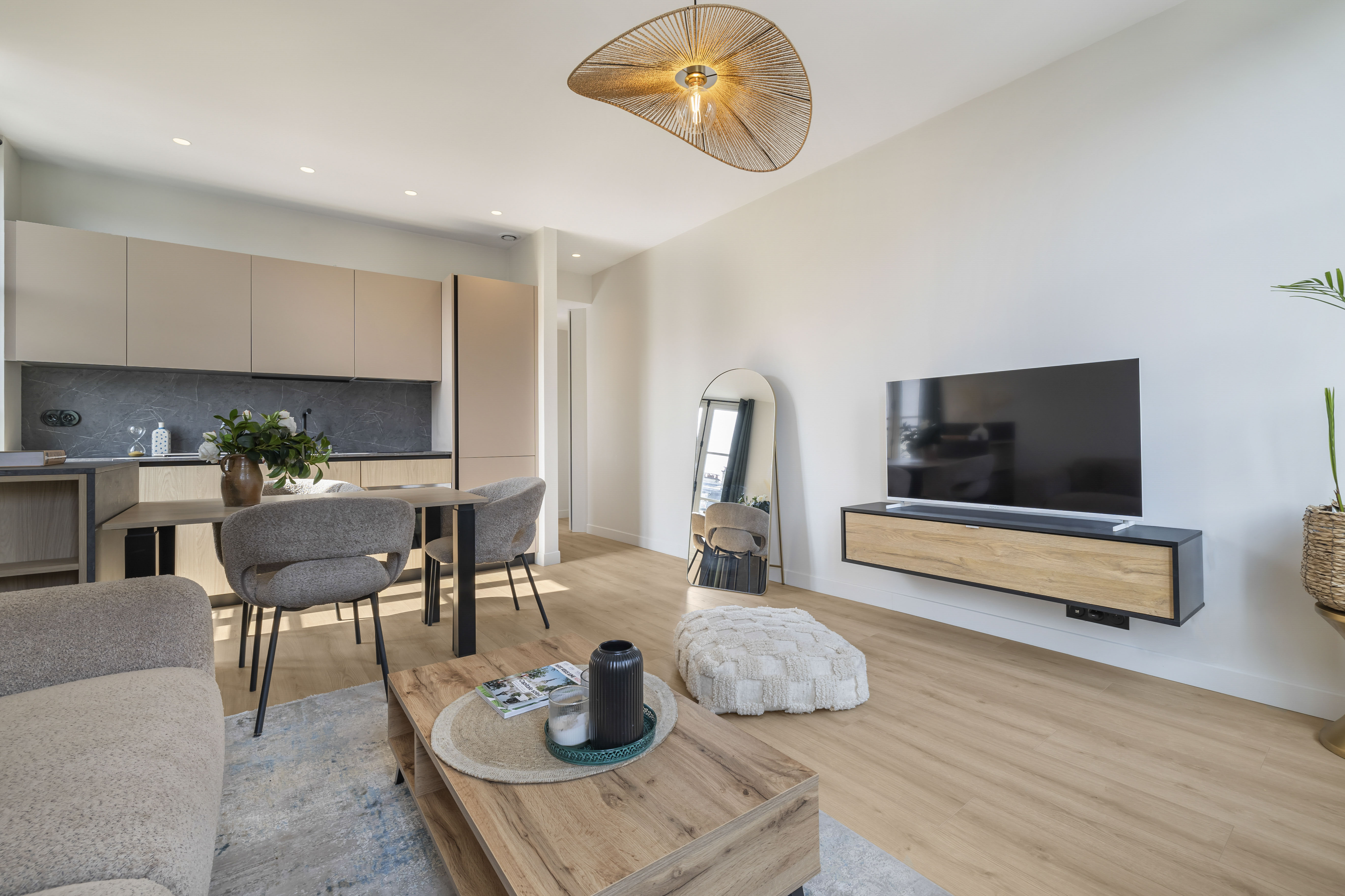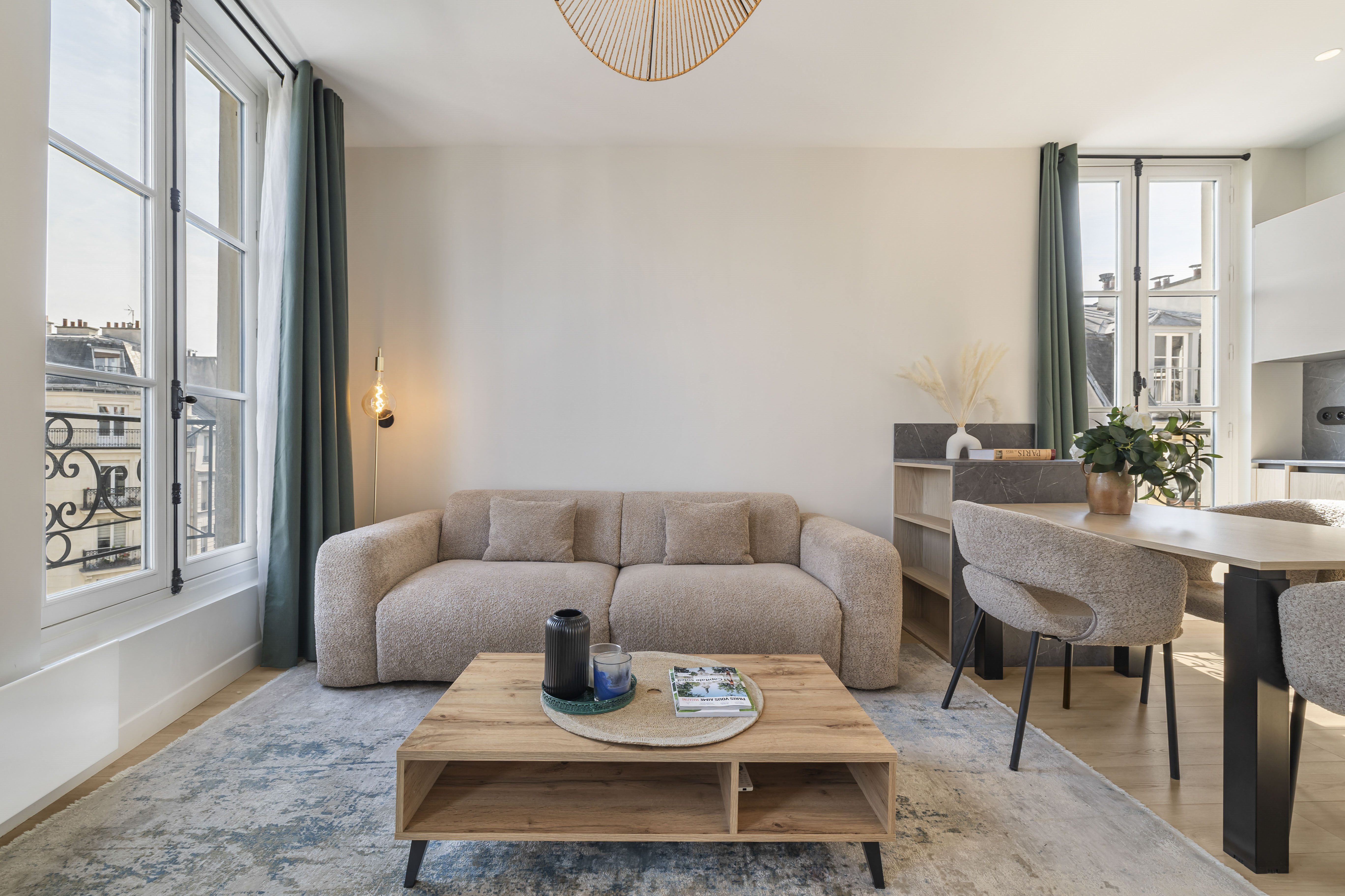 - d'un salon lumineux grâce à 3 grandes fenetres et équipé d'un canapé-lit confortable pour 2 personnes, d'une table basse, d'un meuble TV et d'une TV HD.